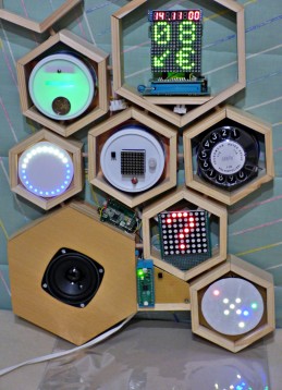 Ich habe eine Zeitlang leere Erdnussdosen als Gehäuse verwendet. Aus Holzresten habe ich dann ein Bienenwaben-Regal gebaut und nach und nach mit Pico Anwendungen bestückt. Fangen wir mal von links oben an. Dort ist eine Erdnussdose mit Einwurfschlitz als Sparschein. Innen wird mit grüner Leuchtdiode die Bereitschaft zum Geldeinwurf angezeigt. Es dürfen hier nur 2 Euro-Stücke eingeworfen werden, damit die automatische Zählung richtig ist. Der aktuelle Stand wird rechts daneben periodisch angezeigt. Dieser Wert wird im Pico als Protokolldatei hinterlegt und bleibt so auch im stromlosen Zustand erhalten.